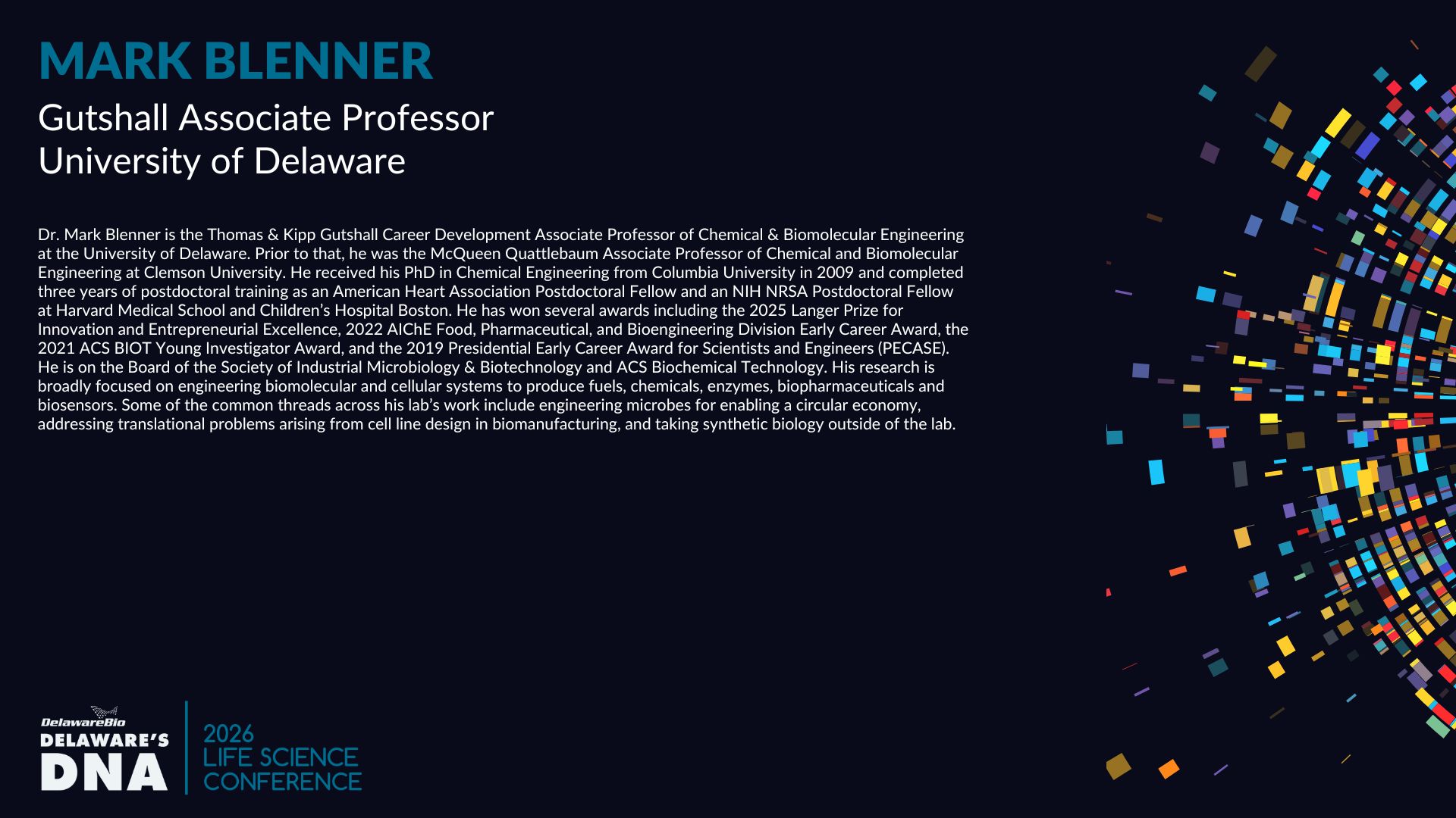 Biomaterials have immense potential for transforming the way we live – with applications ranging from dynamic medical solutions to more sustainable agricultural systems. The session will highlight Delaware’s leading efforts to leverage these technologies across food, energy and medicine, and how synthetic biology is rapidly accelerating development of a new generation of “smart” biomaterials. Networking & Exhibitor Break