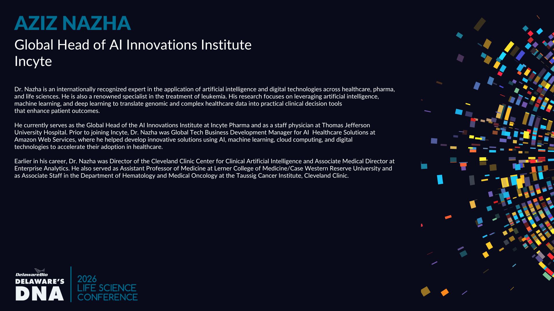 Artificial intelligence (AI) is dramatically reshaping the discovery and development of new medical technologies and therapies – ushering in a future of predictive, personalized, and preventative medicine. Across Delaware’s life science ecosystem, AI is accelerating drug discovery, enhancing diagnostic accuracy and improving patient care. We’ll hear how researchers are deploying this powerful technology and the technical and ethical challenges involved in navigating this immensely complex and exciting terrain. Lunch