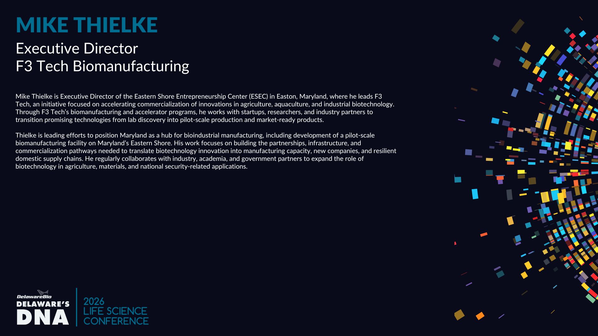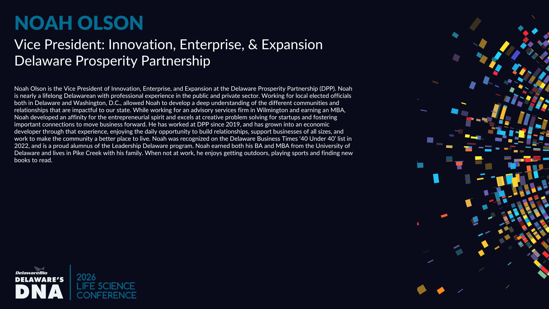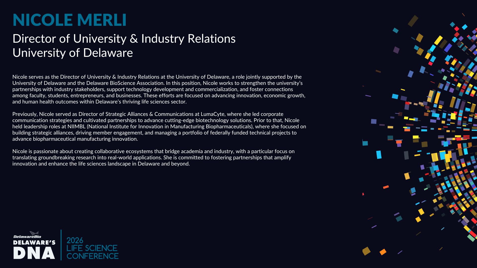 ![]() Delaware's DNA | 2026 Life Science ConferenceThursday, April 30 | 8 AM Join the region’s largest and most influential collection of life science leaders on Thursday, April 30th, for the Fourth Annual Delaware’s DNA | 2026 Life Science Conference! This full day event at the Chase Center on the Riverfront brings together top executives, startups, investors, researchers and policymakers to share new technologies and examine how key trends are shaping the industry’s future. The dynamic program will include rich panel discussions and insightful speakers, a new dedicated IP & Legal session, and focused sessions on exciting developments in biomanufacturing, biomaterials and AI. And Delaware’s DNA exhibition hall will feature the best of cutting-edge research organizations and business service providers! CONFERENCE FEATURESTicketsIndividual and group tickets are available for the 2026 Delaware's DNA Life Science Conference. Please make your selection below. If you are interested in exploring sponsorship opportunities, please contact Jamie Pedrick. AgendaClick below to display the agenda. Registration | Networking Breakfast | Exhibitor Alley